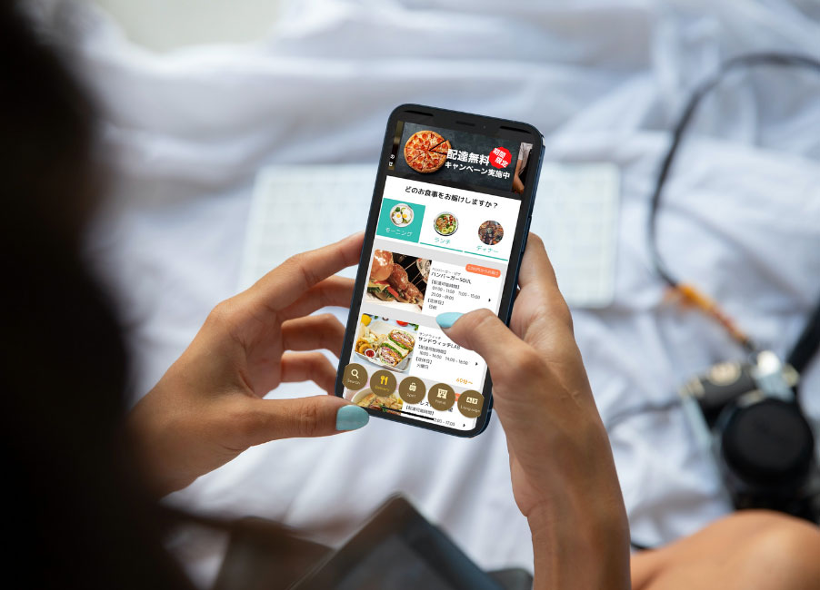 グルームは、スマホで注文するだけで宿泊中のお部屋に近隣飲食店の料理が届く、モバイルルームサービスです。